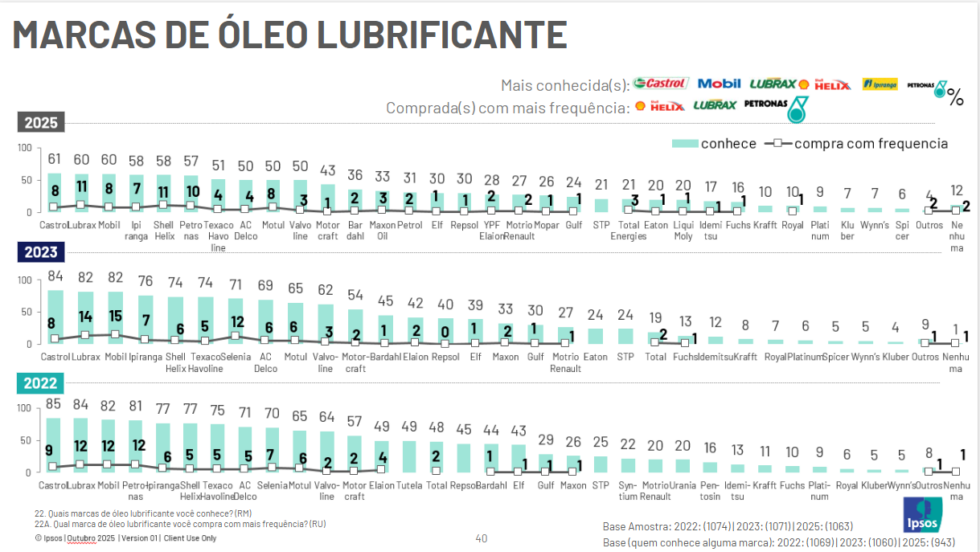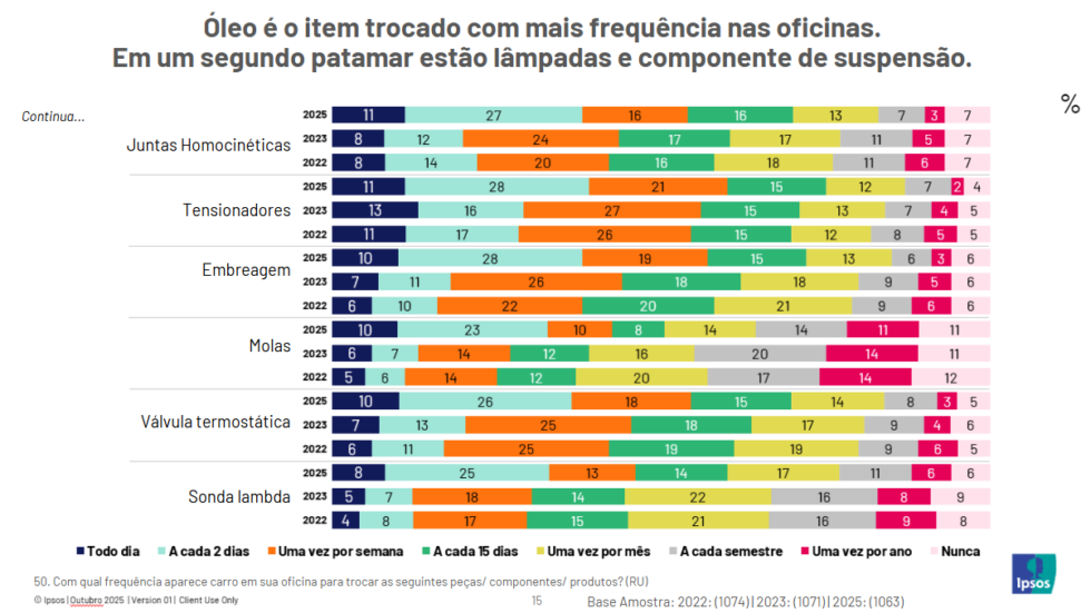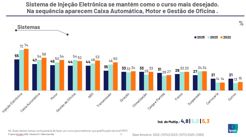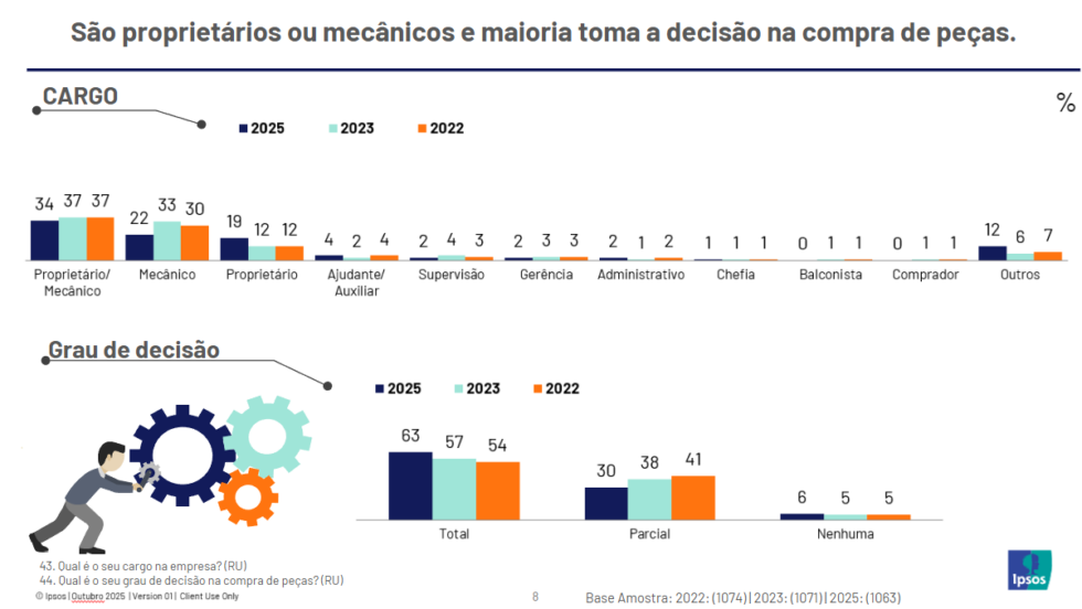 A metodologia adotada foi quantitativa, de autopreenchimento, realizada por meio de entrevistas online com profissionais da área mecânica de 18 anos ou mais, em todas as regiões do Brasil entre 11 de julho e 22 de setembro de 2025. Além disso, os participantes têm 40 anos em média e formação de ensino médio ou técnico. A margem de erro é de 3 pontos percentuais, com nível de confiança de 95%. A amostra foi ponderada para garantir proporcionalidade entre as áreas geográficas do país.