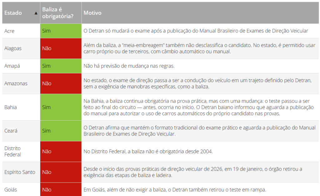 Veja a lista de estados em que a baliza não faz mais parte da prova prática: