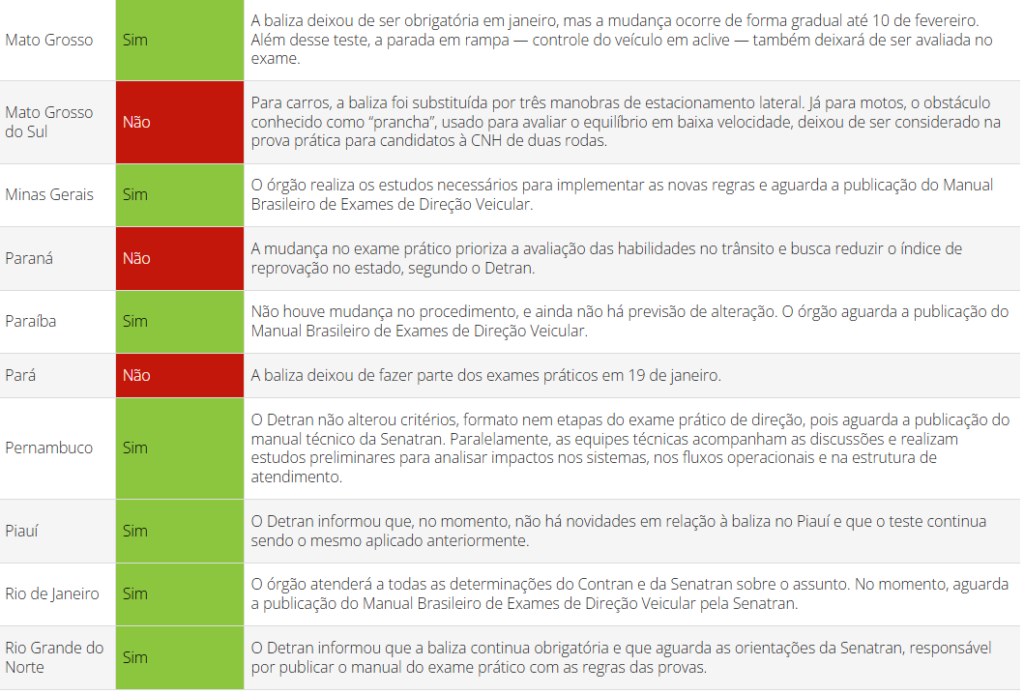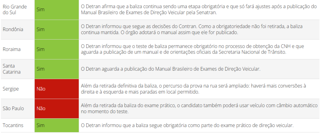 O tema parece novidade, mas já são 10 estados brasileiros que não exigem a baliza na prova prática. O Distrito Federal, por exemplo, deixou de aplicar o teste em 2004. Já no estado de Mato Grosso a baliza deixou de ser obrigatória em janeiro, mas a mudança ocorre de forma gradual até 10 de fevereiro.
