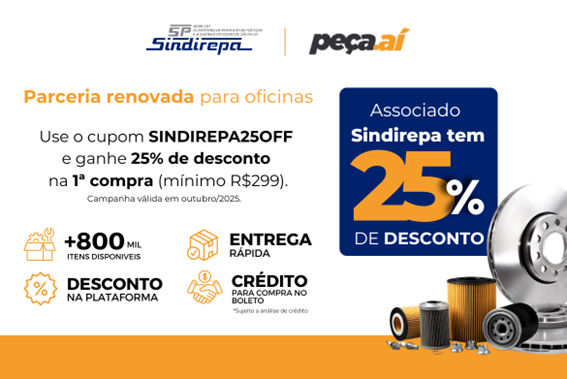 O objetivo é claro: trazer ainda mais benefícios e praticidade para o dia a dia das oficinas mecânicas. E para celebrar esse novo momento, todos os associados Sindirepa ganham 25% de desconto na 1ª compra acima de R$299 na plataforma válido até dia 31/10/2025.